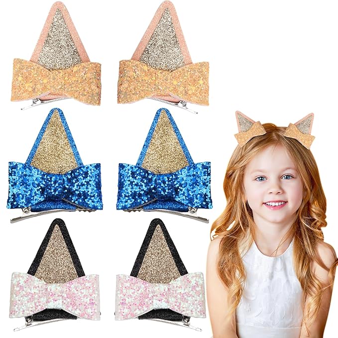 6 Pcs Blue Ears Hair Clips, Glitter Hair Barrettes with Bows, Blue Hair Pin Accessories for Halloween Costume Birthday