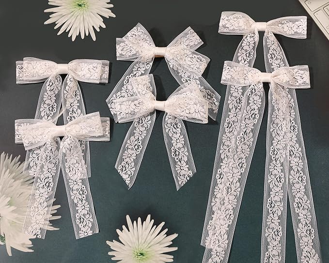 White Lace Tulle Hair Bows with Long Tail Ribbons, Metal Bowknot and Tassel Barrettes for Women