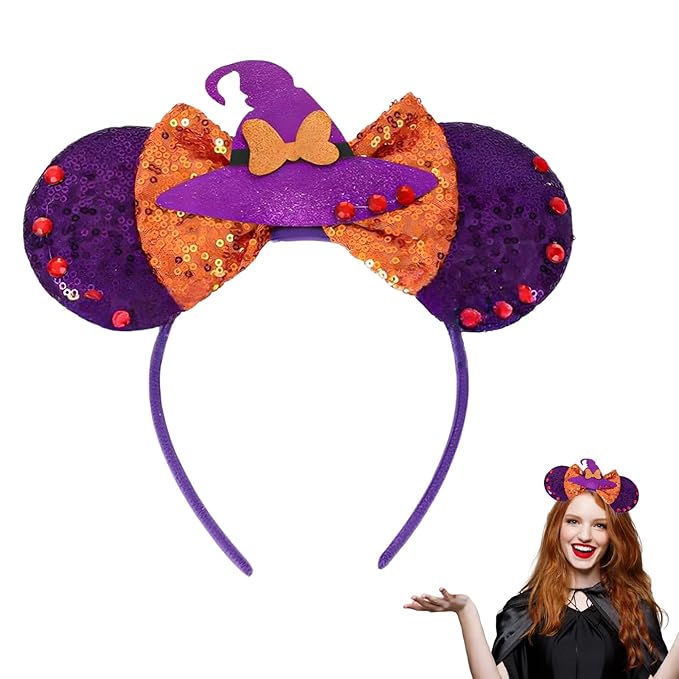 Halloween Mouse Ears Bow Headband, Glitter Sequin Witch Hat Halloween Headbands for Women, Cute Hair Bands Hair Accessories